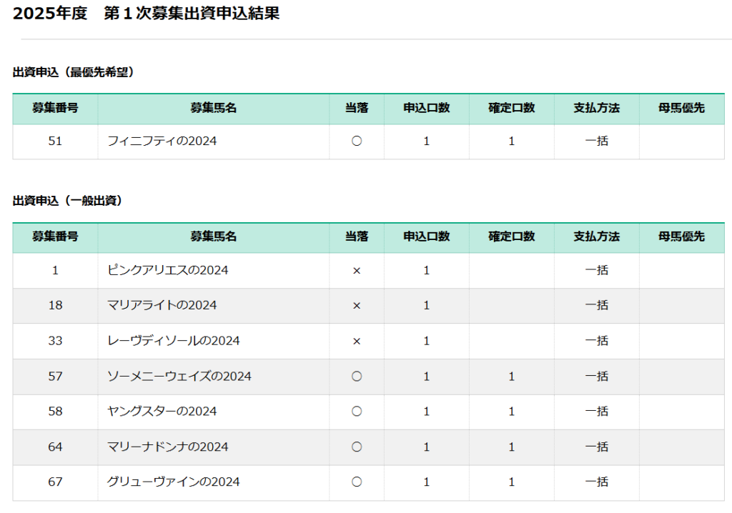 キャロットクラブの2025年度第1次募集出資申込結果が確定しました。