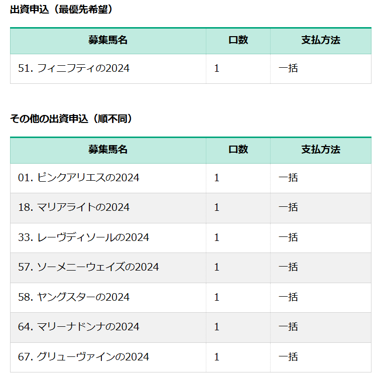 元々最優先はレシステンシアの24(牡・父モーリス)に出そうと思っていたのですが、昨日の中間発表でかなり人気していることが判明しました。最優先で出しても5~6割くらいしか通らない予想がSNS上でもあったため、もう1頭候補にあったフィニフティの24(牡・父ロードカナロア)に変更しました。こちらも距離はマイルまでが主戦場になりそうですが、レシステンシアの24よりかはまだ距離融通が利きそうなのと、マイルに強い藤原英昭厩舎カナロア×母父ディープのニックス、ロードカナロアが本格的に高齢になる前に産駒に一度出資したかったというのがあります。
